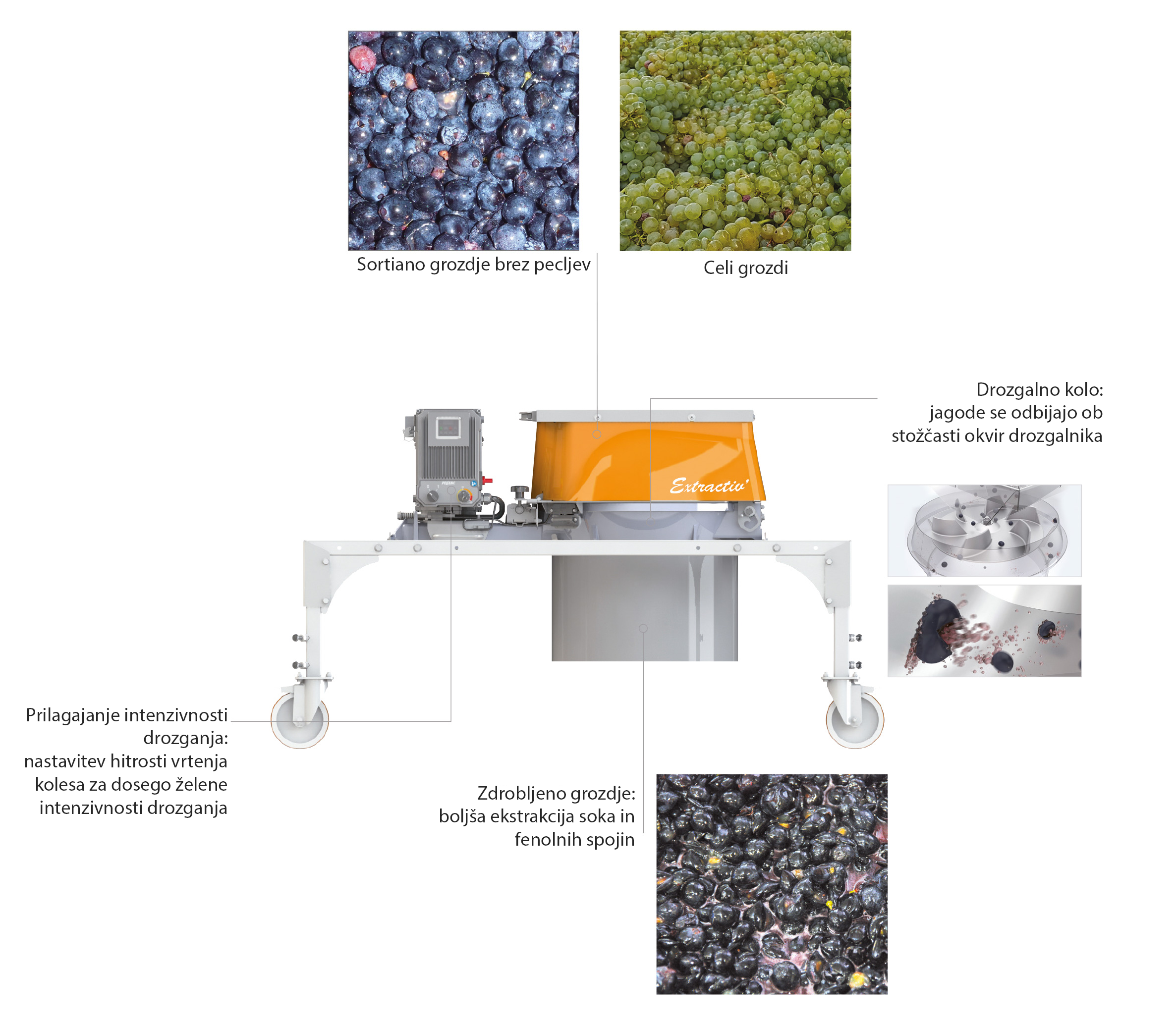 Inovativni pristup muljanju omogućuje optimalno otvaranje bobica prema njihovoj zrelosti. Rezultat je bolja ekstrakcija soka, polifenola i aromatskih spojeva – ključnih za bogata, harmonična vina.